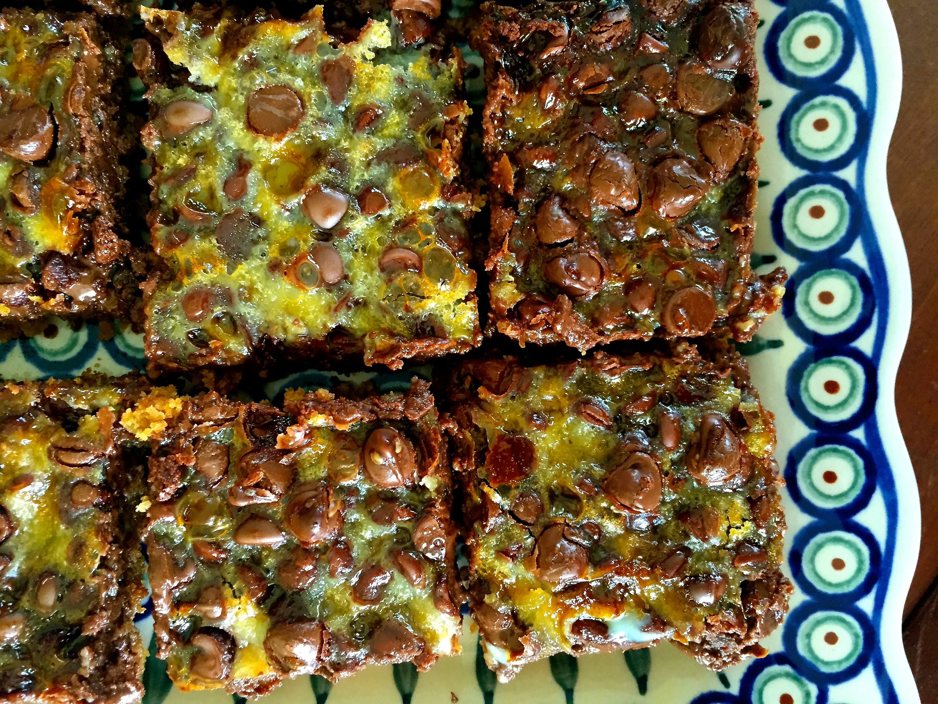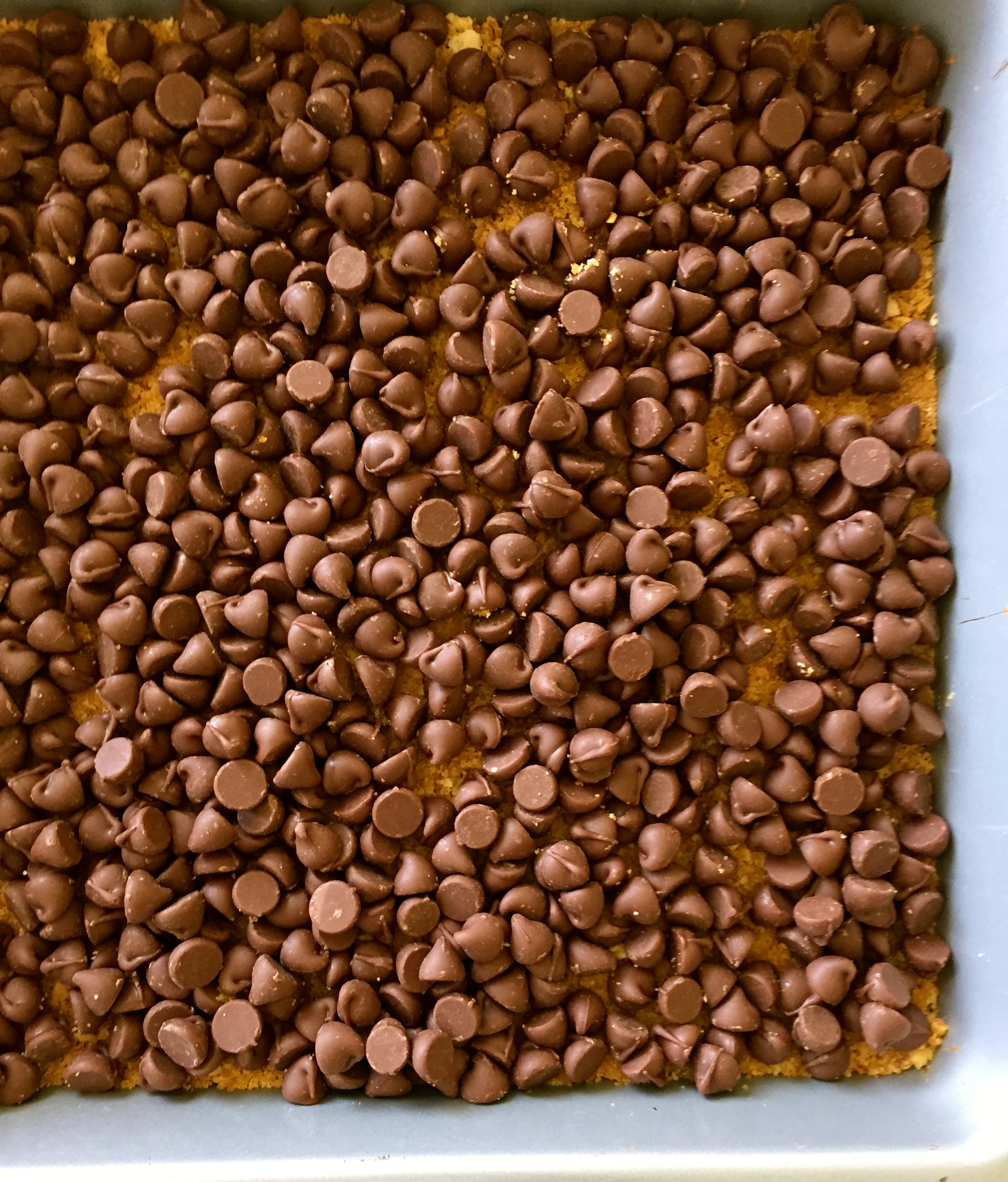 Once it is out of the oven, pour in the chocolate chips and then evenly pour the condensed milk over this. Then it goes in the oven for 20-25 minutes. Make sure the condensed milk doesn’t burn, and just turns a nice golden colour.