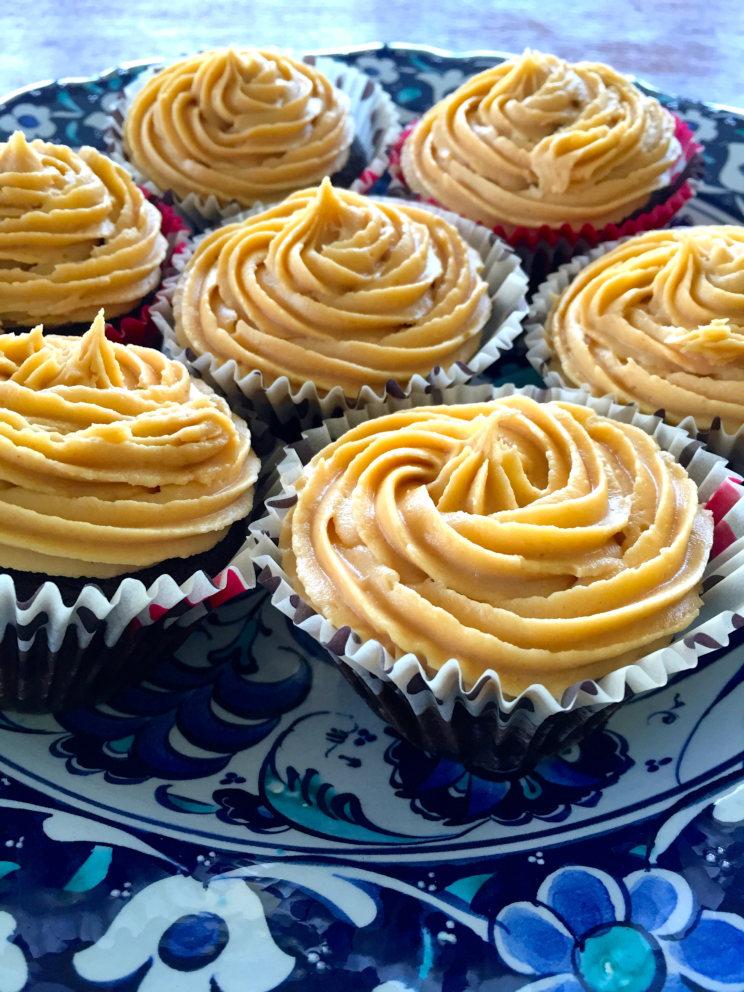 In the oven for 21-23 minutes. Once cooled (after eating one plain) – time to frost with the following Peanut Butter Frosting Recipe: